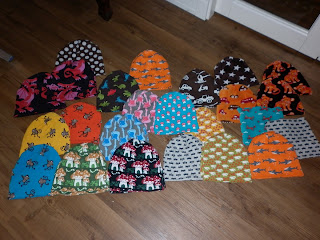 Vaikka olenkin tässä viimeaikoina ommellut paljon itselleni, ei poikani ole jäänyt paitsioon. Viikon aikana valmistui pari paitaa ja läjä uusia kankaita on odottamassa. Pipotehtailukin on tässä sivussa jatkunut tasaiseen tahtiin.
